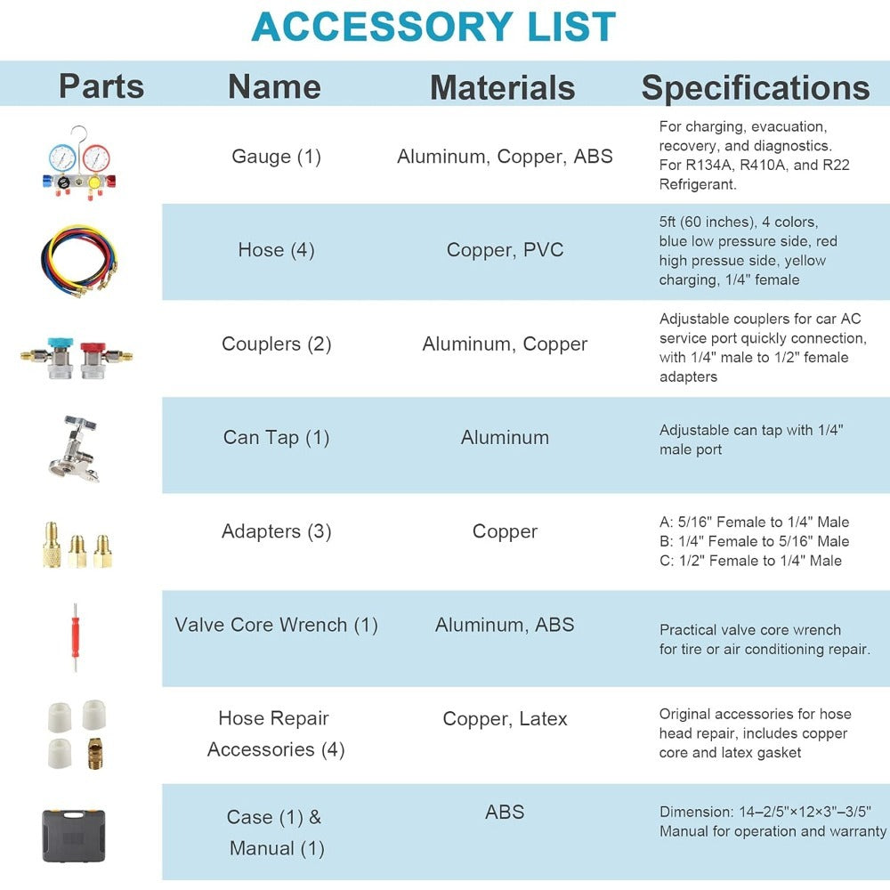 WIDE APPLICATION: This car AC gauge set works with R134a, R22, and R410a refrigerants; ideal for both DIY and professional HVAC maintenance, it allows you to measure your system's pressure, evacuate and refill coolant, and more; a heavy-duty foam-lined carrying case comes included for easy storage and transport between jobs