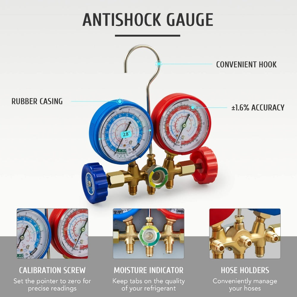 - WIDE APPLICATION: This car AC gauge set works with R134a, R12, R22, and R502 refrigerants; ideal for both DIY and professional HVAC maintenance, it allows you to measure your system's pressure, evacuate and refill coolant, and more